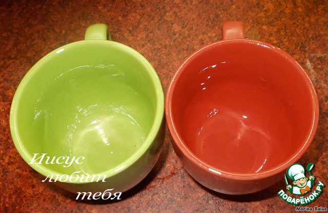 Дальше нам надо две чашки. Смазываем их растительным маслом. (Смазываем их только один раз)