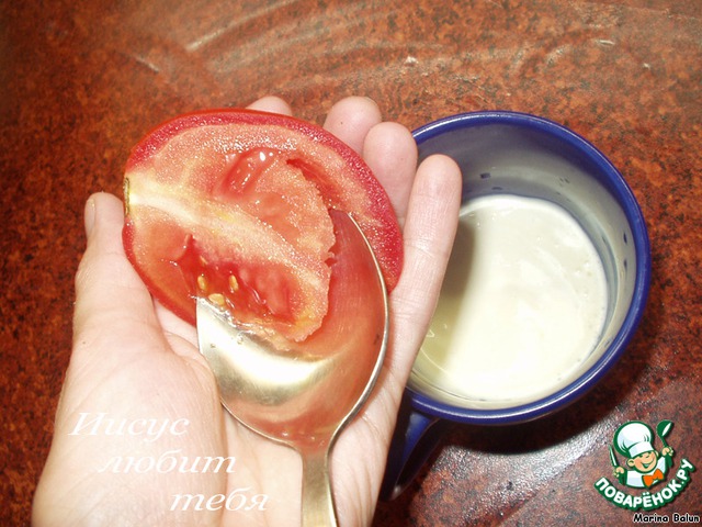Готовим соус: в майонез кладем внутренность от помидора (или двух, если маленькие), перемешиваем с помощью блендера. Соус готов!