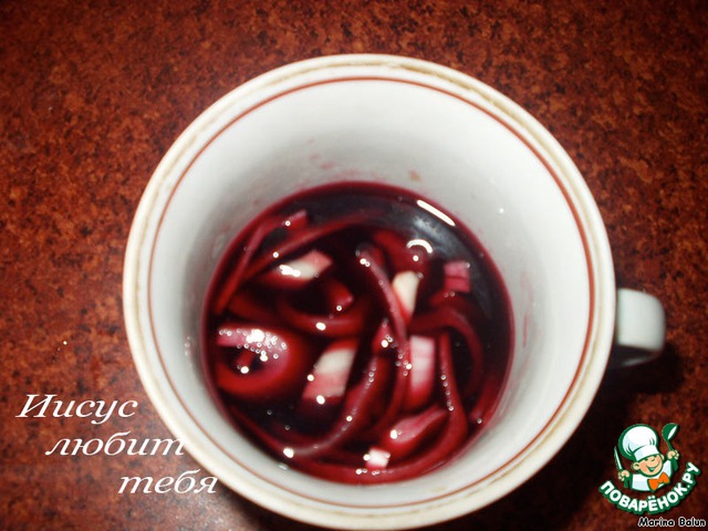 Режем аккуратными полукольцами лук, заливаем его свекольным бульоном и добавляем 3-4 столовые ложки уксуса.