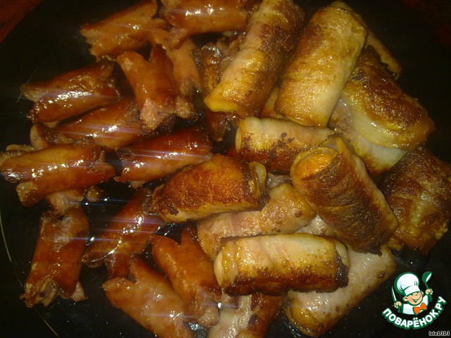 Подготовить мини-сосисочки:можно обернуть их полосками бекона,можно сделать надрезы крест на крест с обоих концов.Обжарить сосиски в масле.