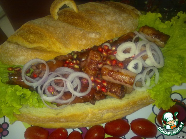 Теперь собираем наш "большущий бутерброд":выкладываем листья салата на дно"горшочка",затем мини-сосиски и украшаем кольцами лука и зёрнами граната.