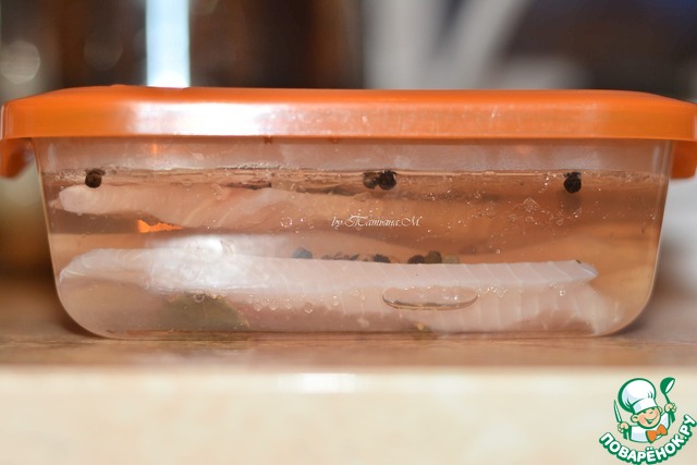Рыбку уложить в емкость, добавить лавр, залить маринадом (теплым или холодным), оставить на 1 сутки при комнатной температуре;
