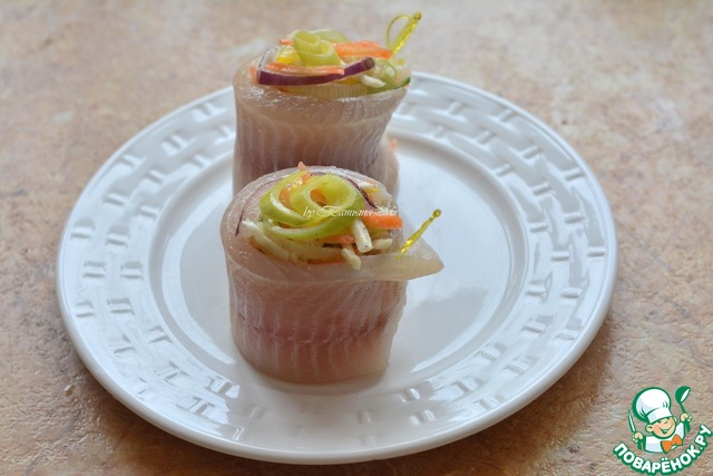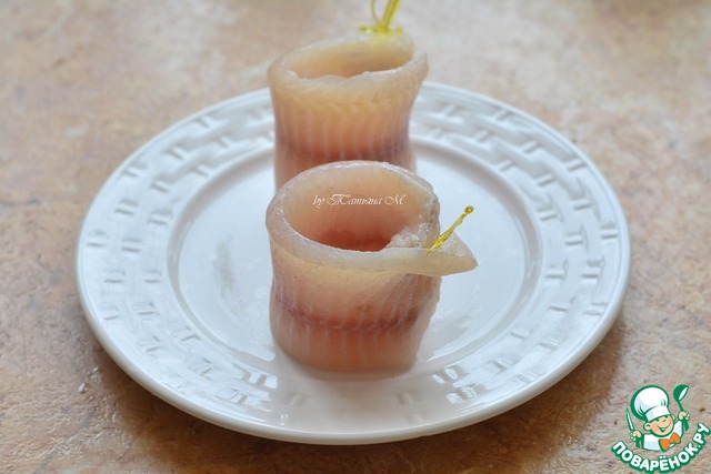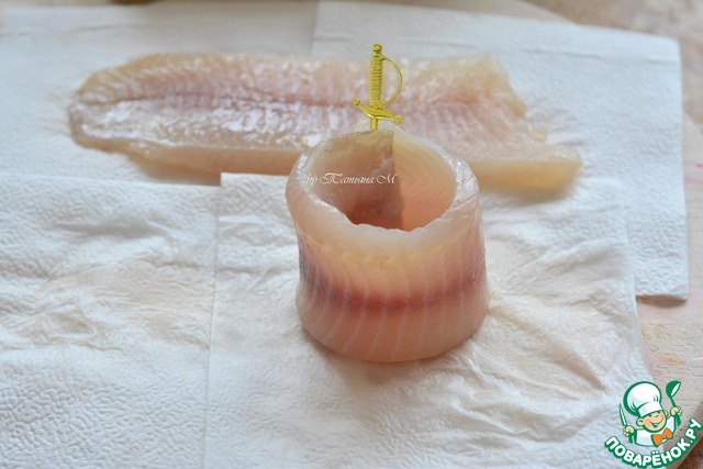 Сформировать рыбку цилиндром, фиксируя вилочками для канапе;