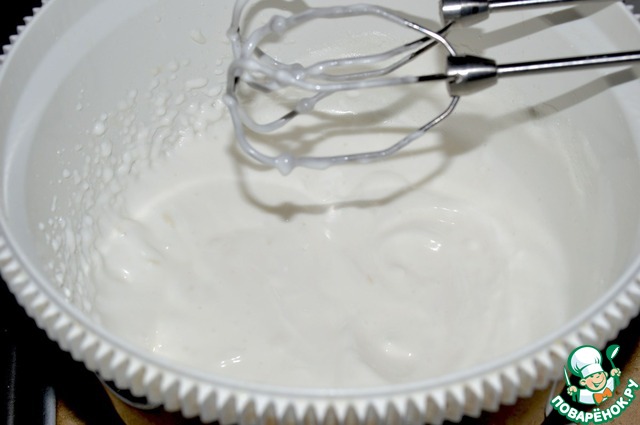 Когда он загустеет (превратиться в пену) постепенно всыпать сахар смешанный с ванилином и влить лимонный сок. Взбивать до пиков.