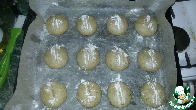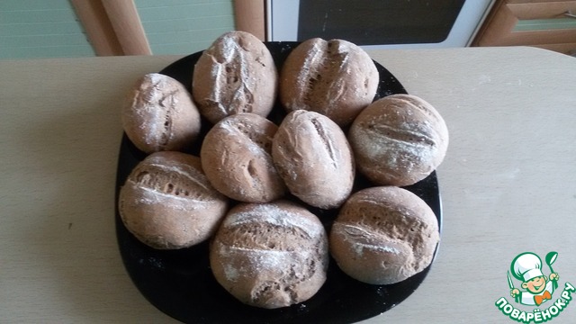 Из каждой части сначала формируем шар, затем овал, приплюснутый сверху и снизу. Противень застилаем бумагой для выпечки, смазываем растительным маслом и присыпаем мукой. Выкладываем булочки на расстоянии 2-3 см. В каждой булочке делаем продольный, неглубокий надрез, сверху присыпаем ржаной мукой. Оставляем на 30 минут для расстойки. Выпекаем в предварительно нагретой духовке при t 180градусов 20-25 мин. Если у Вас такая же жаркая духовка, как моя, и пригорает низ изделий, то советую поставить в низ духовки ёмкость с водой и печь минут 15- 20, затем емкость убрать, чтобы булочки подрумянились.