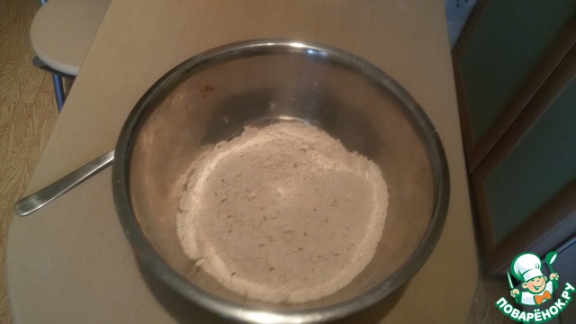Пшеничную муку просеиваем, добавляем дрожжи, отруби, соль, тмин, какао. Всё перемешиваем.