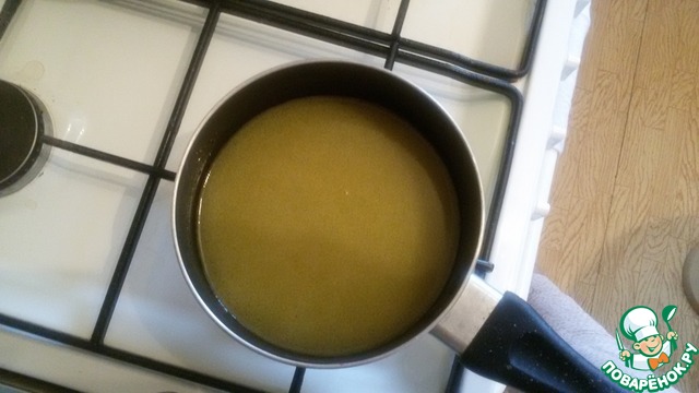 В сотейник вливаем 2 стакана горячей воды, добавляем сахар и масло. Перемешиваем и остужаем до t 38-40 градусов.