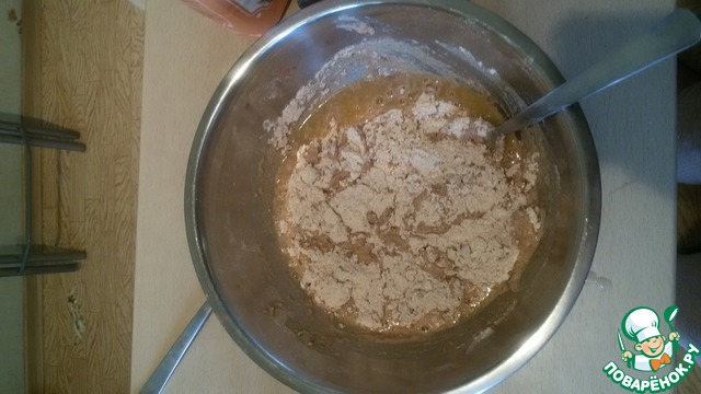 Вливаем сахарно-масляную смесь в мучную смесь, добавляем ржаную муку.
