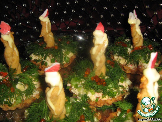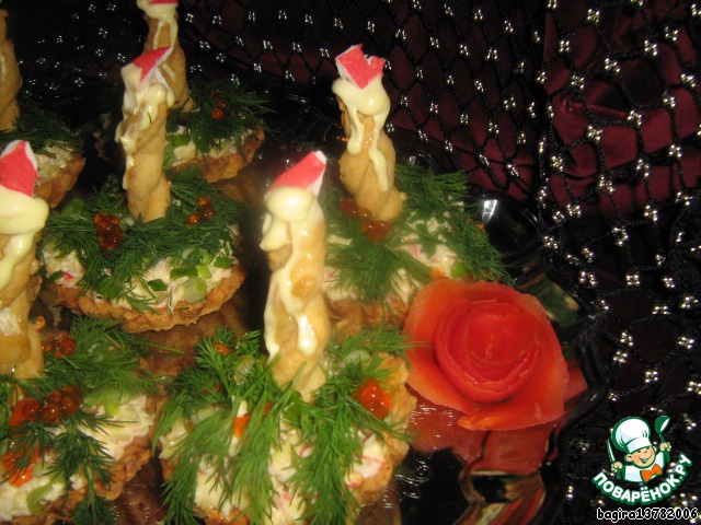 Наполняем тарталетки начинкой, в середину которых вставляем свечу. Верх свечи смазываем майонезом, укрепляем пламя свечи, вырезанное из крабовой палочки, а на самой свече делаем "потеки воска" майонезом. посыпаем начинку нарезанным зеленым луком.