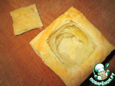 Слоеное тесто, не раскатывая, нарезать примерно на такие кусочки. У меня с одного листа получилось 9 штук, всего 18