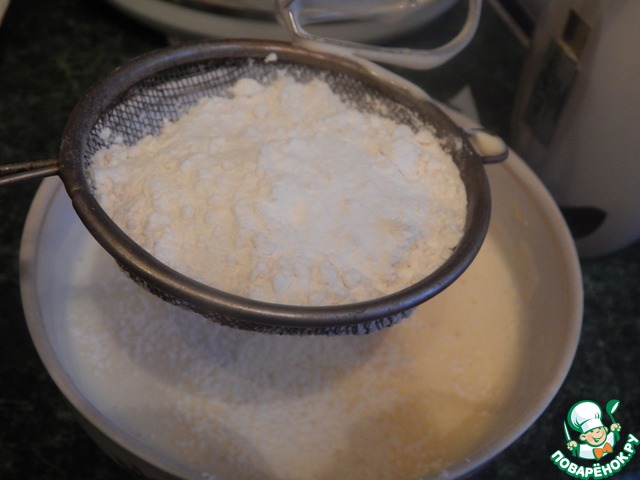 Добавить просеянную муку и разрыхлитель. хорошо перемешать тесто. Оно будет как густая сметана