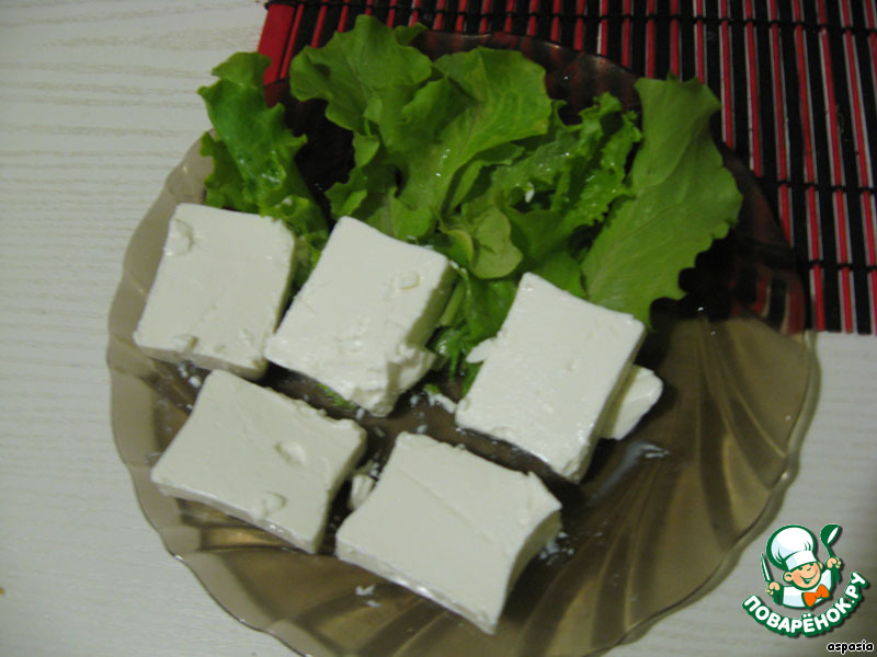 Нарезаем брынзу кусочками и выкладываем на тарелку с листьями салата (1 минута)