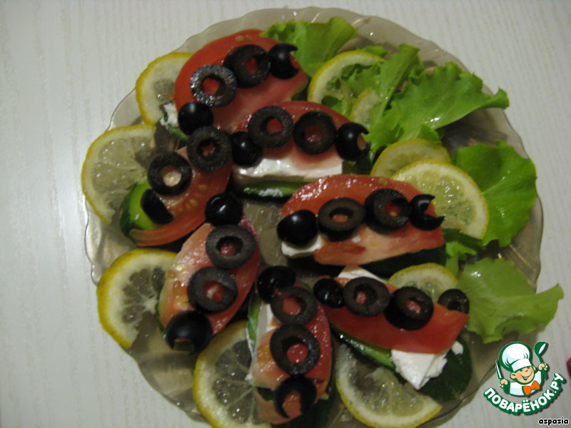 На каждый кусочек брынзы положили пластик помидорчика (можно взять помидорчик черри), нарезали маслинки. Добавили кусочки лимончика...(3 минуты)