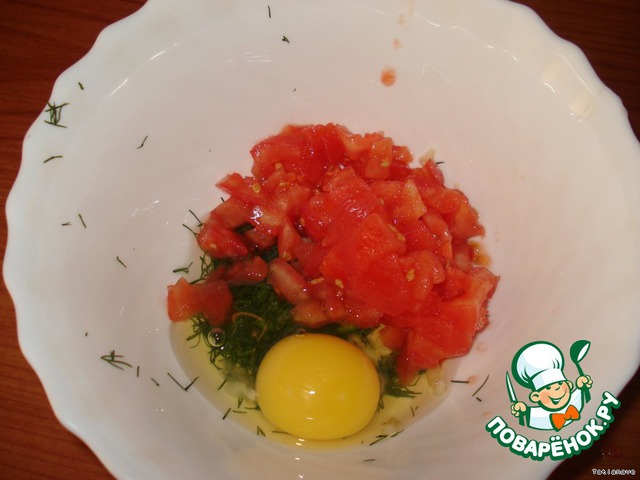 Измельченный помидор отправился к чесночной зелени, туда же вылить яйцо, посолить, поперчить.