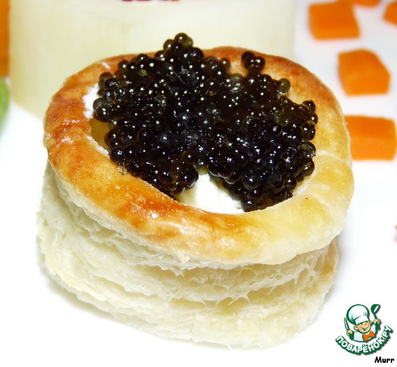 Слоёные тарталетки также наполняем сыром и сверху украшаем тобикой
