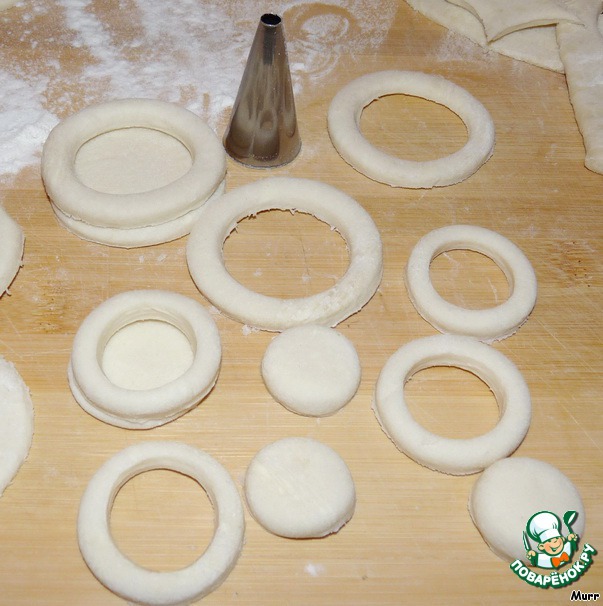 слоeное тесто раскатываем, вырезаем кружочки и колечки, смазываем яйцом, выпекаем до готовности.