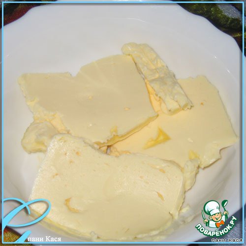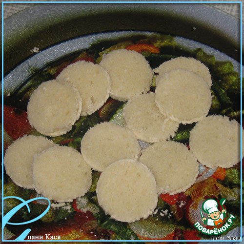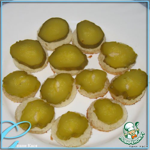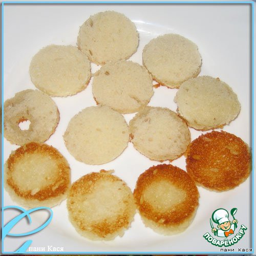 Белый хлеб нарезать толкими кусочками, вырезать кружочки (или квадратики, треугольнички... только корочку срезать).