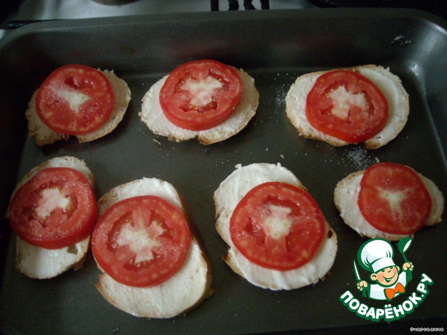 | Кусочки батона с рыбным салатом, запеченные под сыром. |