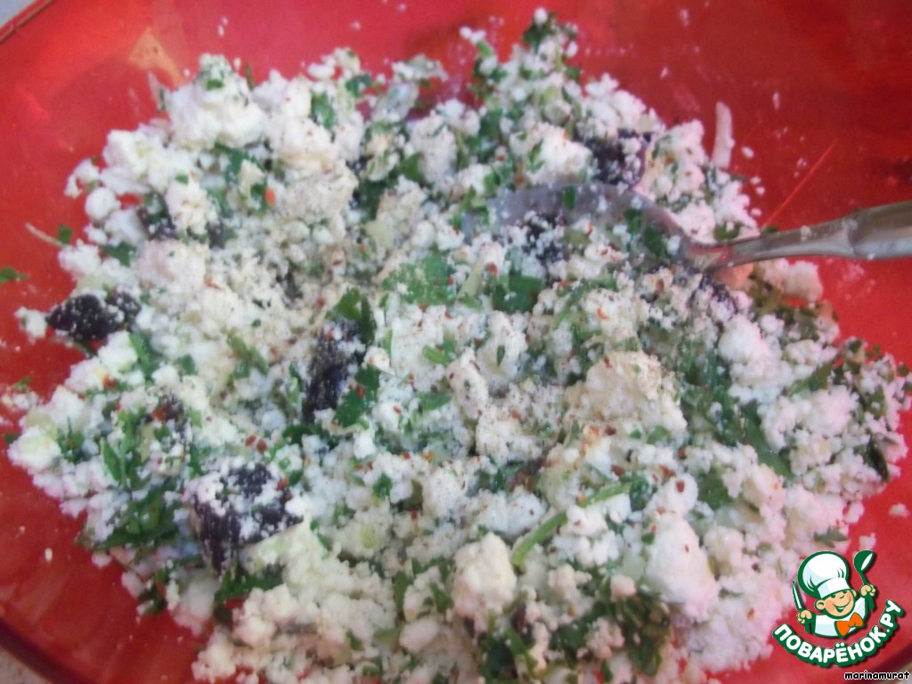Делаем начинку: смолоть в блендере петрушку и лук-порей, мелко накрошить 1/2 огурца, оливки нарезать на четвертинки, смешать с творогом, добавить перец черный и красный, другие приправки - по желанию, посолить (у меня был соленый творог).