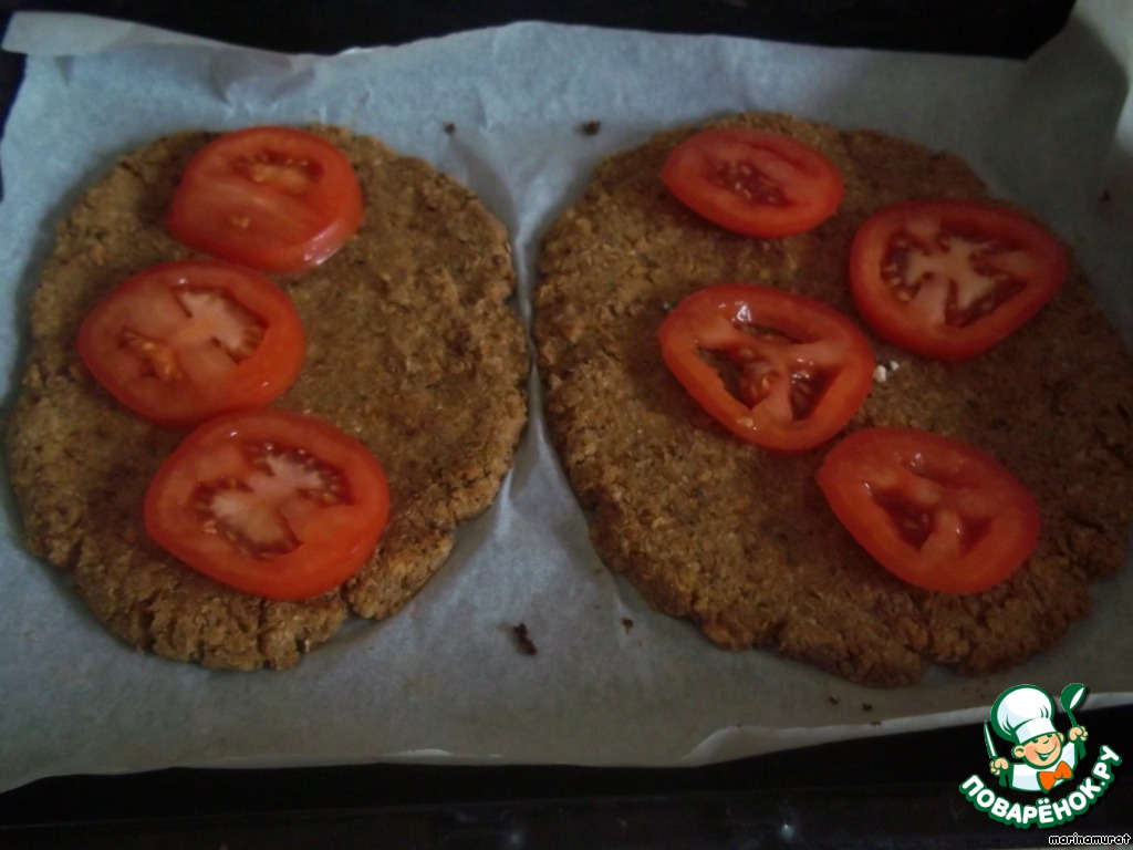 Достаем лепешки. Режем помидор на кружочки и кладем на лепешки.