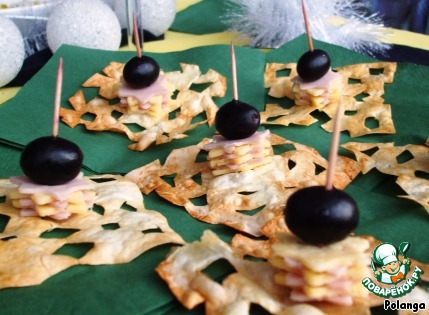 Из сыра и ветчины вырезать звезды. Насадить на зубочистку, сверху украсить маслиной. Поставить на снежинки.