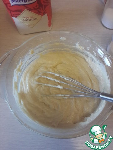 Всыпаем манку в медовую смесь, размешиваем венчиком и оставляем на 10 минут