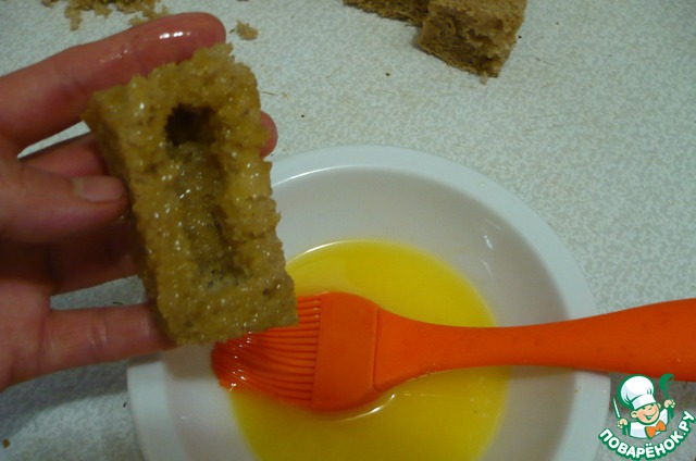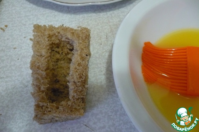 Пока занимаемся резьбой по хлебу, ставим масло в микроволновку и растапливаем. Кисточкой намазать корзинку со всех сторон.