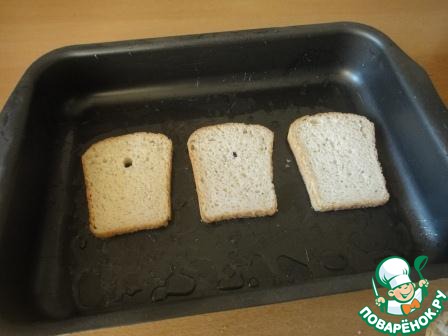 Форму смазываем маслом и выкладываем ломтик хлеба.