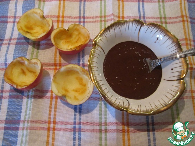 Яблоки помыть, обсушить, разрезать на половинки, из которых ложкой аккуратно вынуть мякоть, оставляя небольшой слой возле кожуры. Шоколад растопить на водяной бане.
