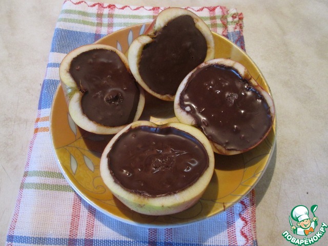 Растопленным шоколадом заполнить яблоки и убрать в холодильник на полчаса. После застывания шоколад осядет, поэтому немного подправим края яблок.