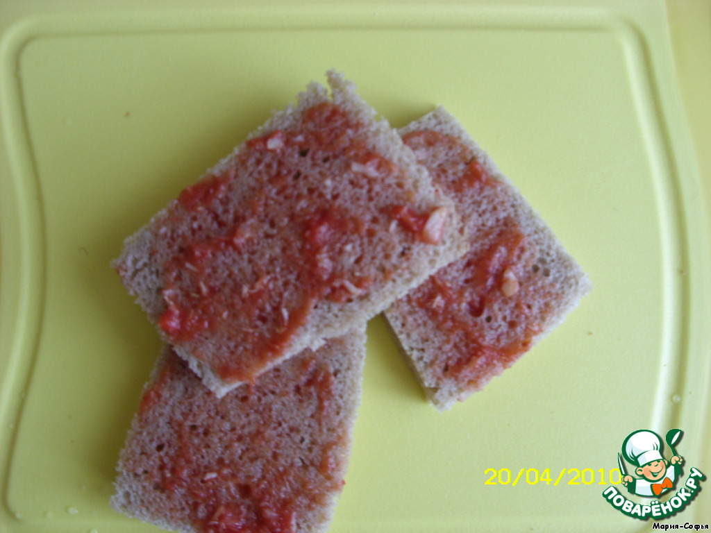 Хлеб нарезать ломтями, удалить корочку и пропитать хренодером.