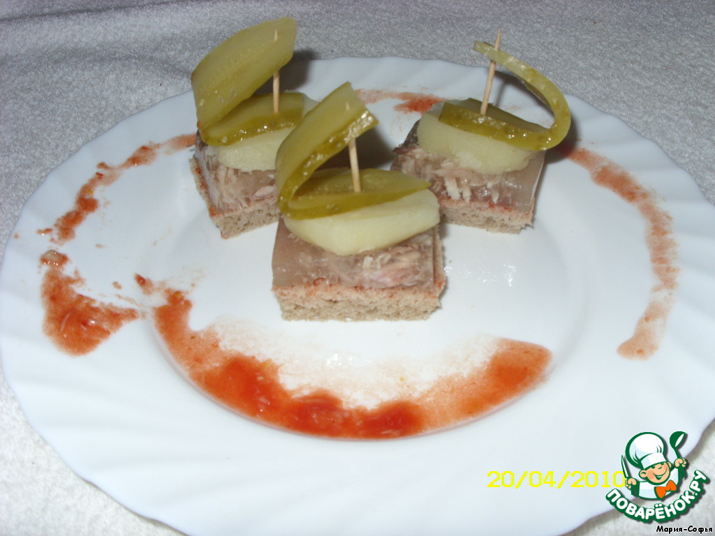Собираем канапе: хлеб промазанный хренодером, студень, ломтик картошки произвольной формы.