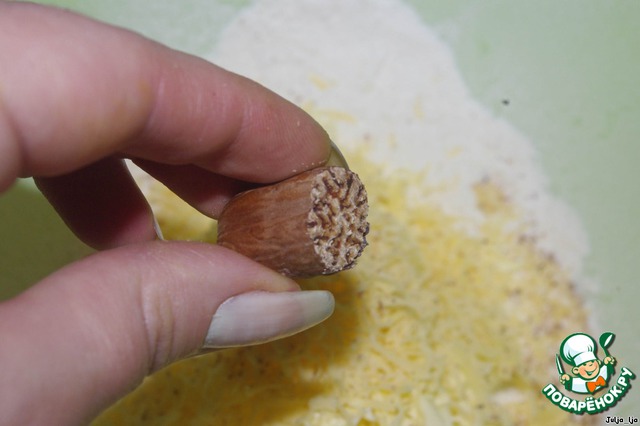 Немного солим по вкусу. Натираем на самой мелкой тёрке мускатный орех. Можно использовать готовый молотый, но свежий натёртый гораздо ароматнее.