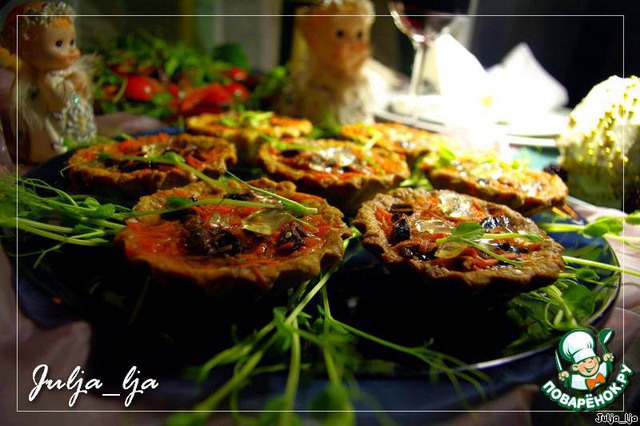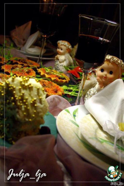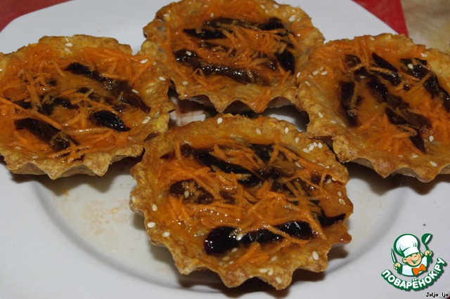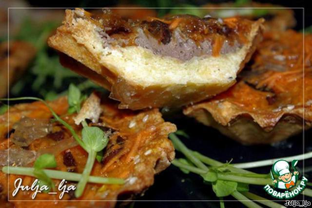 | Рассыпчатые тарталетки из песочного теста с добавлением сыра и кунжута, начинeнные нежнейшим паштетом из утиной печени, томлeной в сливках с вишнями, белыми грибами и луком пореем под прозрачным желе.. Просто наслаждение! На конкурс "Gorenje: новогодняя композиция". |