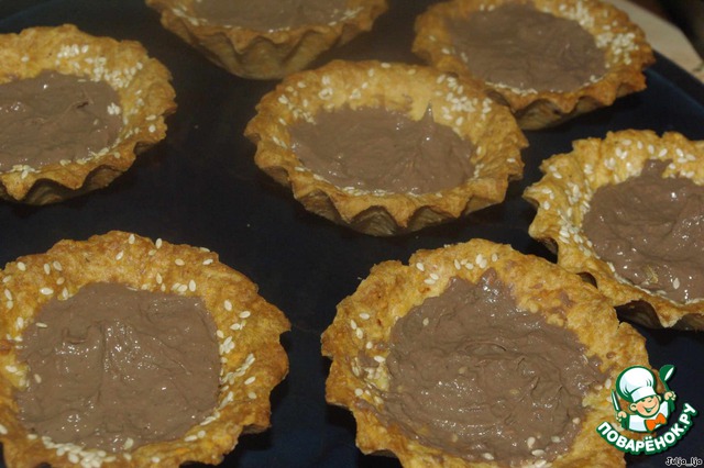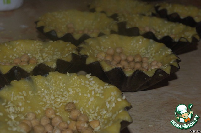 В это время подготовить формы. У меня старинные металлические формы. Я их смазала маслом и присыпала слегка мукой. Через 40 минут формируем тарталетки. Отрываем кусочки теста размером с большой орех и распределяем его по форме, стараясь, чтобы толщина стенок и дна, была одинаковая. Края посыпаем кунжутом, слегка вдавливая его в тесто. На дно формочек кладём фасоль или горох, также слегка вдавливая. Это нужно, чтобы тарталетки сохранили форму при выпечке.