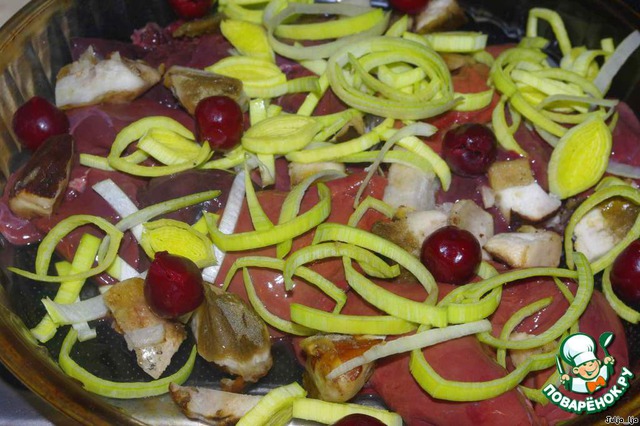 Первым делом нужно заняться паштетом. Это самый длительный процесс. Утиную печень хорошо промываем, очищаем от плёночек, выкладываем в жаропрочную форму. К печени кладём нарезанный лук-порей, белые грибы и вишню.