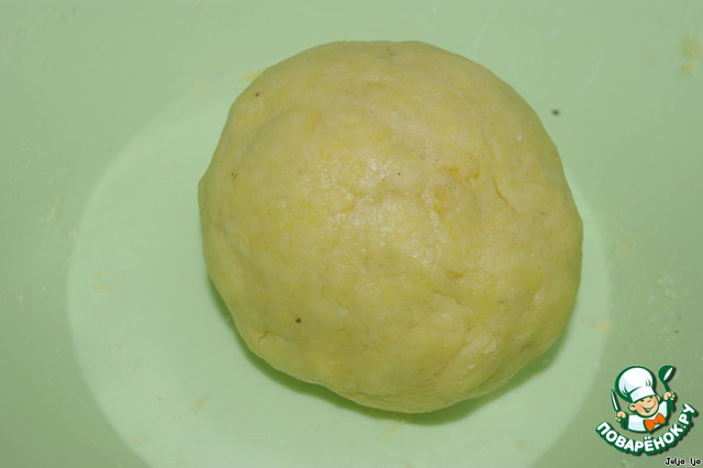 Тесто скатываем в шарик, заворачиваем в пищевую плёнку и кладём в холодильник минут на 40-50.