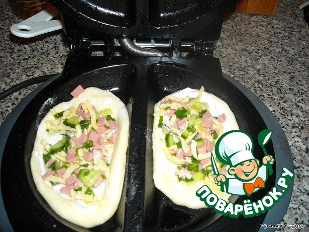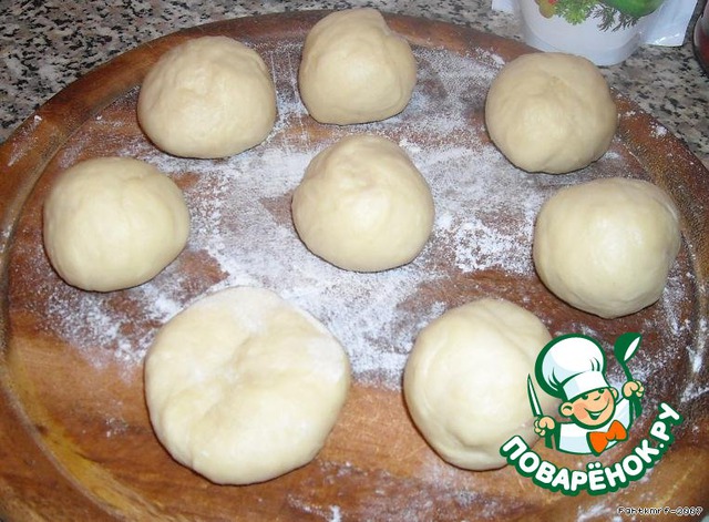 Сковорода смазана, тесто (маленькие шарики) раскатаны в одном направлении, уложены и смазаны небольшим количеством майонеза