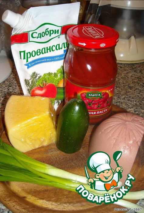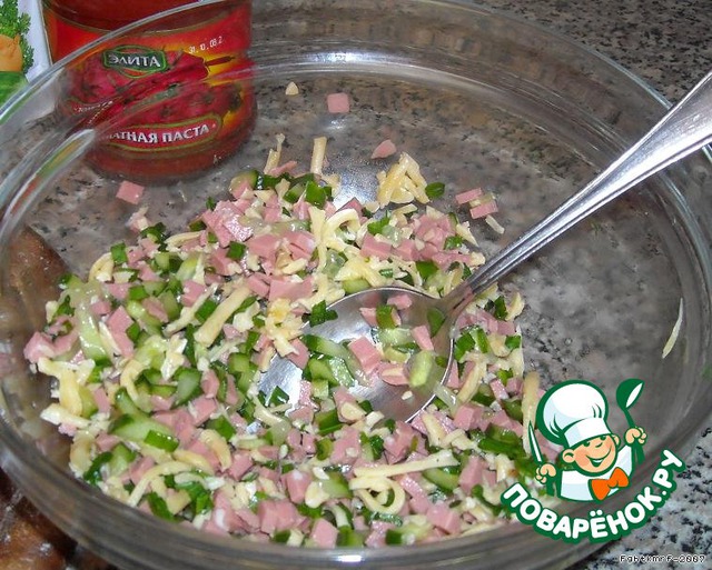 Половинка огурца, 4 пера лука, сыр на терке, 3 кружочка колбаски (!) нарезаны мелко-мелко