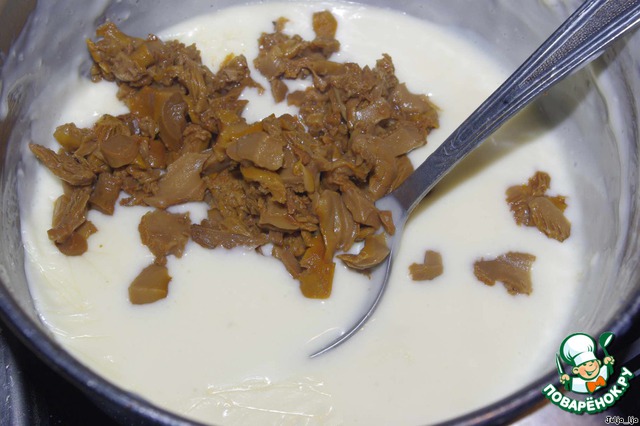 На медленном огне (можно на водяной бане), постоянно помешивая, доводим смесь до однородного, кремообразного состояния. Остужаем немного и добавляем нарезанные грибы.