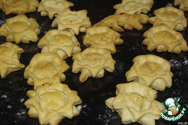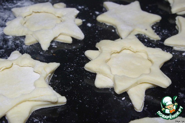 Складываем две заготовки так, чтобы лучики "звёздочек" не совпадали. Получатся "цветочки". Выпекаем их в разогретой до 170 градусов духовке до готовности.
