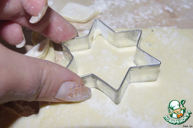 Тесто размораживаем, раскладываем на столе. Можно немного раскатать. Вырезаем фигурки. Я, чтобы получились цветочки, делала их формой "звёздочка". Количество "звёздочек" должно делиться на 2.
