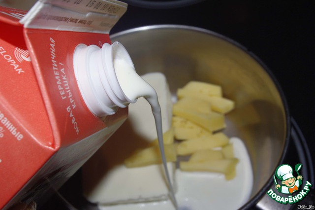 Добавляем сливки. Кстати, ни соль ни перец я в этой закуске не использовала. Добавила только немного мускатного ореха в начинку.