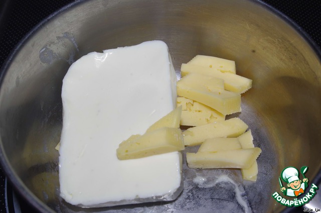 Для начинки, в кастрюльку кладём плавленый сыр (без добавок, просто сливочный) и твёрдый сыр. Я его просто нарезала, но для ещё большей быстроты процесса, можно его натереть.