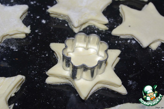 У половины звёздочек формочкой "цветочек", вырезаем серединку. Можно просто вырезать круг.