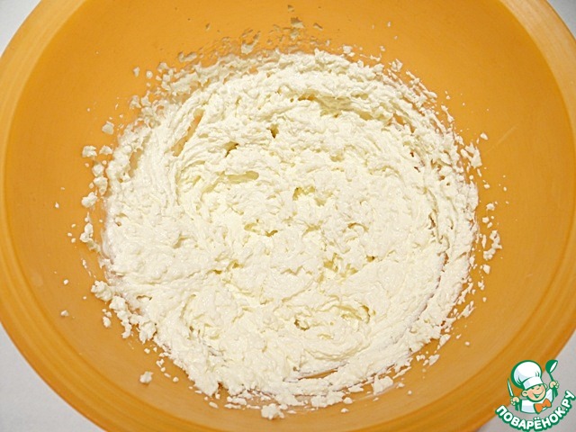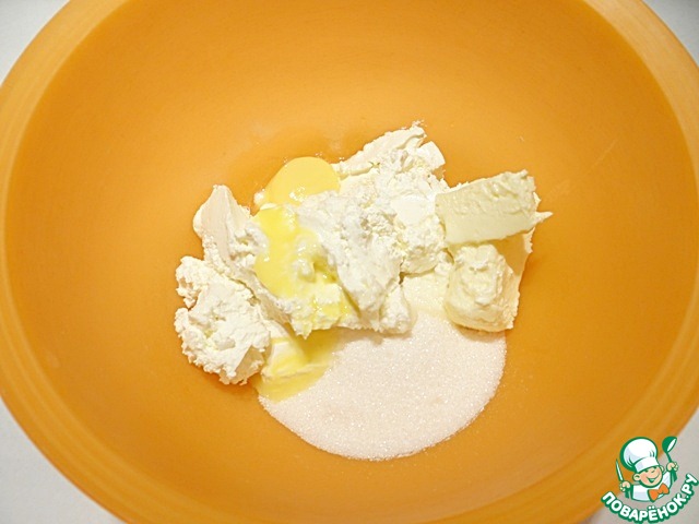 В миске соединяю сливочный творожный сыр, творог, сахар, ванилин, сливочное масло комнатной температуры, желтки, разрыхлитель.