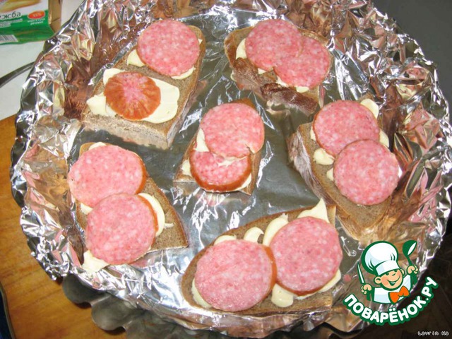 Разогреваем духовку. В форму выкладываем куски хлеба, каждый кусок смазываем майонезом, сверху кладем по 2 кусочка вашей любимой колбасы (или отварного мяска)