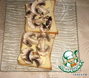 Выкладываем тонко нарезанный сыр и шампиньоны на тостовый хлеб.