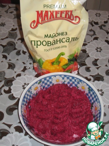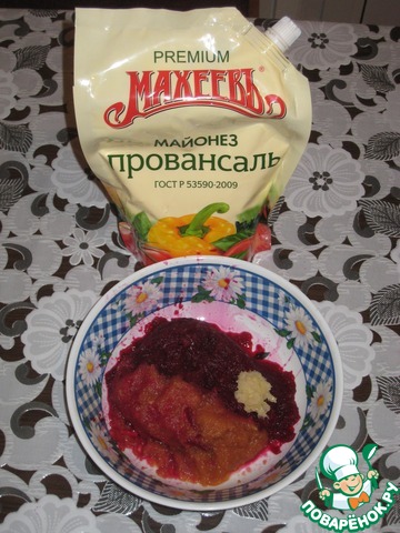 5. Смешайте свеклу, яблоко, чеснок, заправьте майонезом "Махеев"; должно получиться вот такое пюре