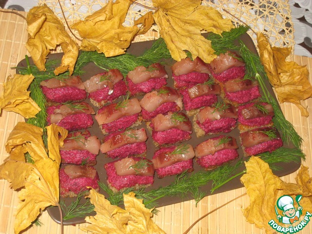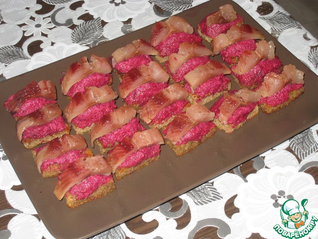 6. Эту массу выложите на каждый кусочек хлеба, сверху положите очищенную и нарезанную на маленькие кусочки селедку